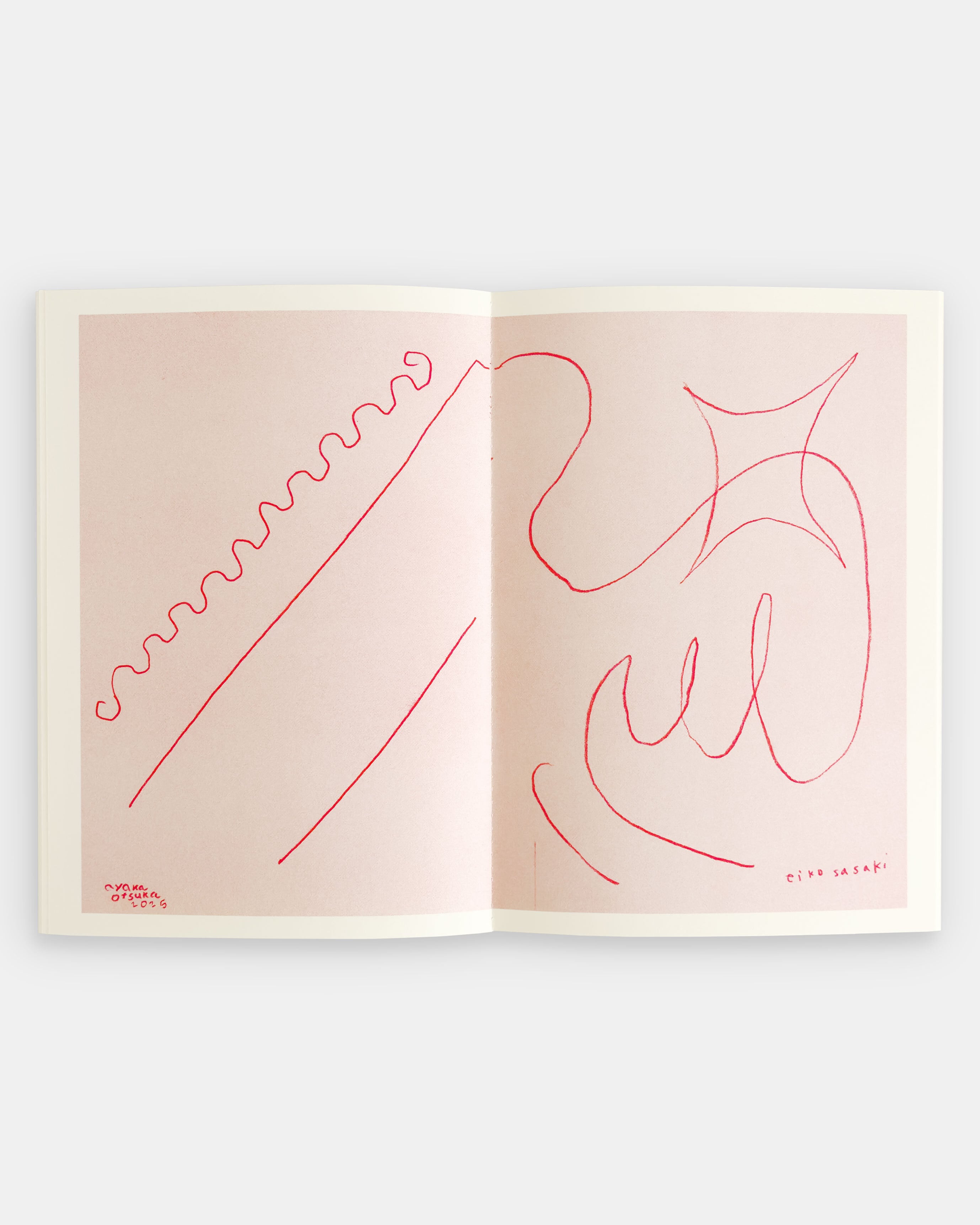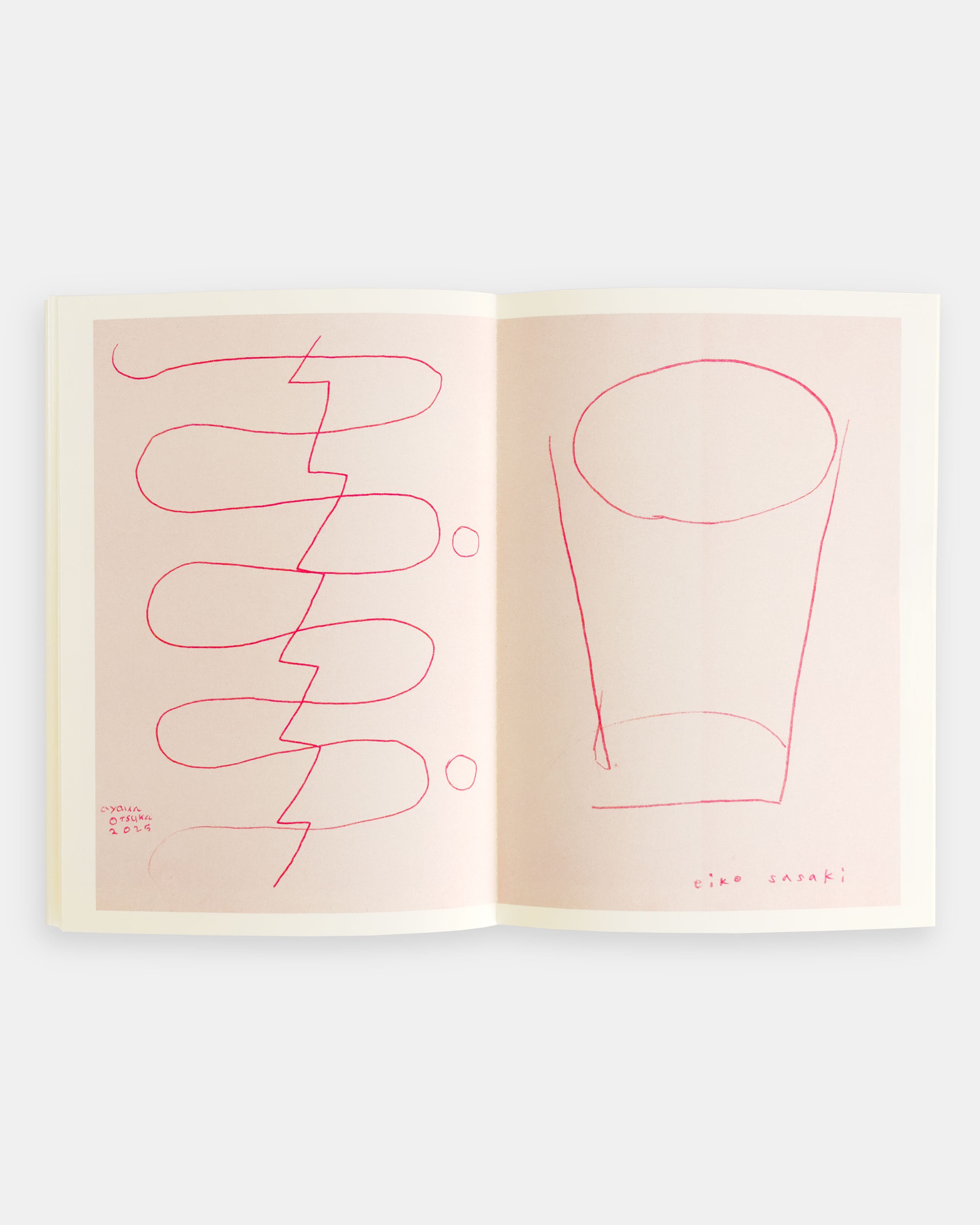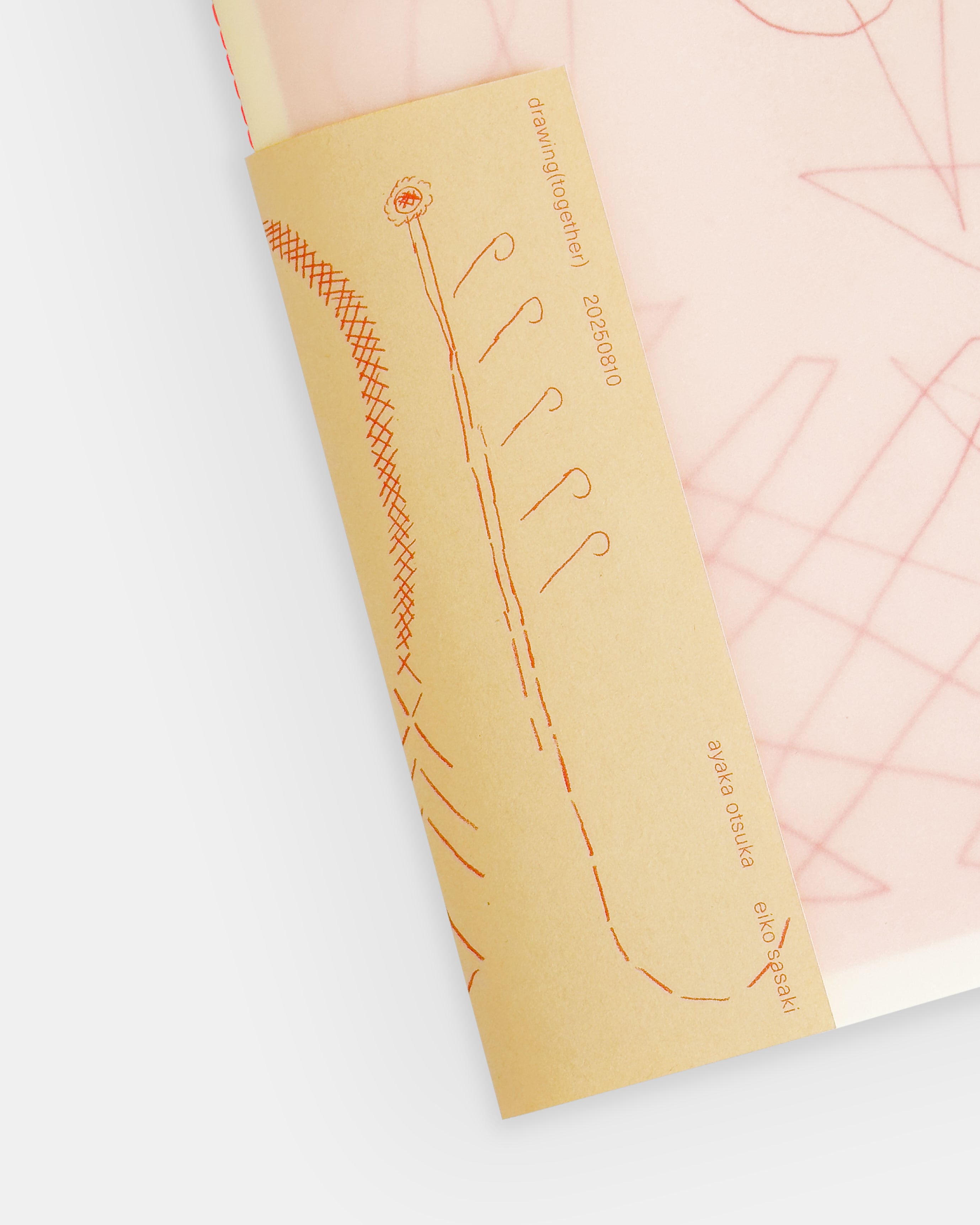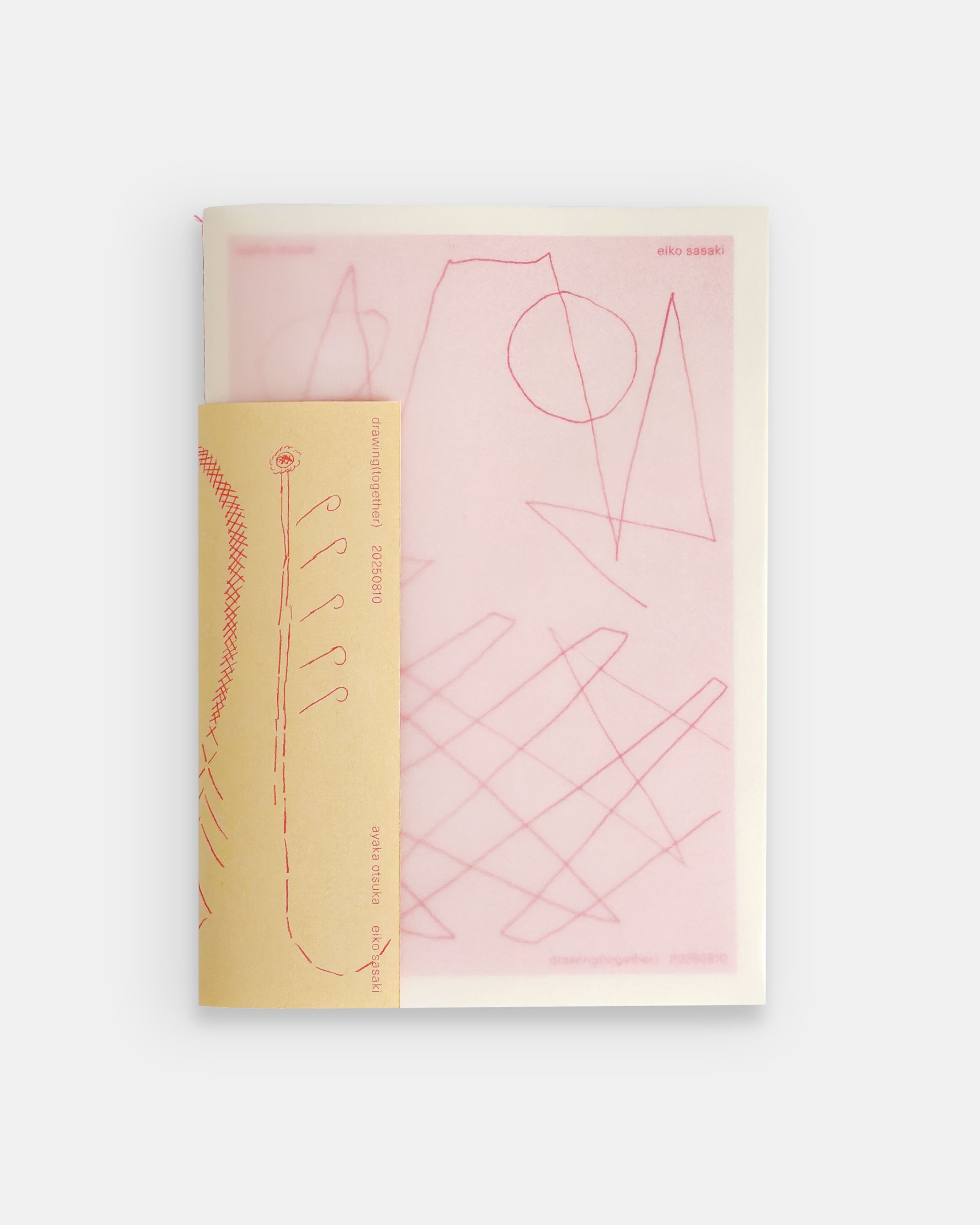 This book contains drawings from the event “drawing (together)” by Ayaka Otsuka and Eiko Sasaki, held as part of the exhibition “3:3” at the Nakameguro secondhand bookshop “dessin” in August 2025. Based on the Surrealist collaborative technique “le cadavre exquis”, the two artists conducted a public collaborative creation. Each artist used half a sheet of paper, creating their section without viewing the other's work, attempting an improvisational dialogue of images. The works reproduced in this book are printed in monochrome red using the risograph process. Each artist's signature is placed near their respective drawing, allowing viewers to distinguish and compare which parts belong to whom. The cover includes an accompanying sheet of tracing paper. The red ink and binding thread create a visually striking volume. Includes a risograph mini-print cover.