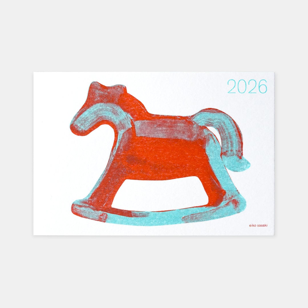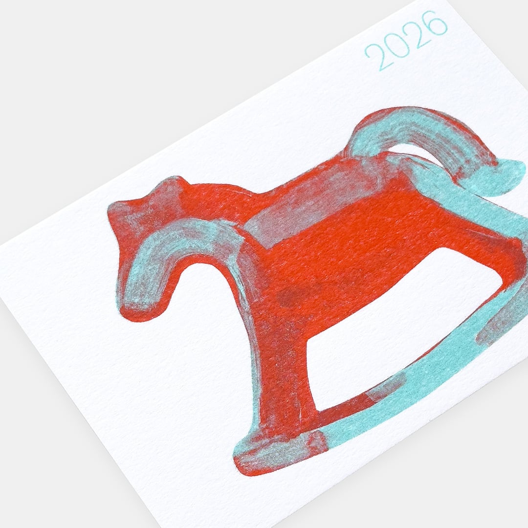 2026年の干支「午(馬)」モチーフのアートワークをリソグラフ印刷したカード。インクは朱×ミントの2色。在庫限りとなります。