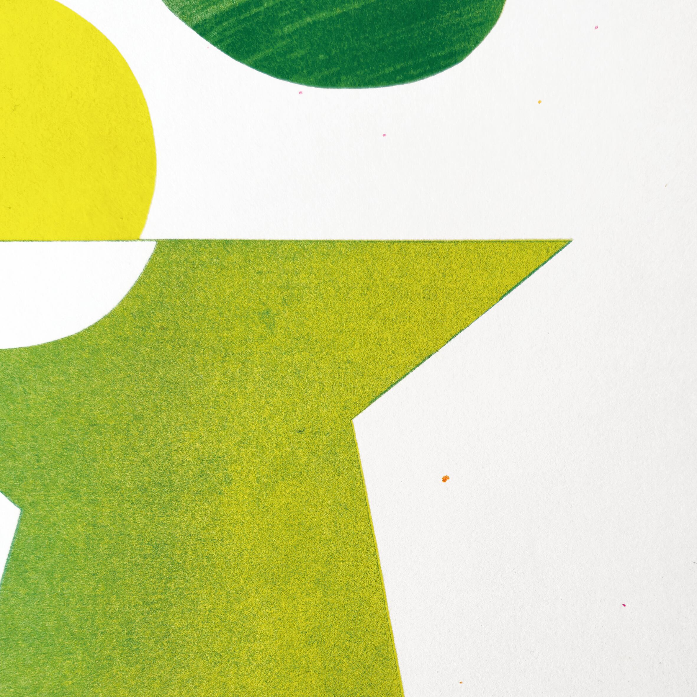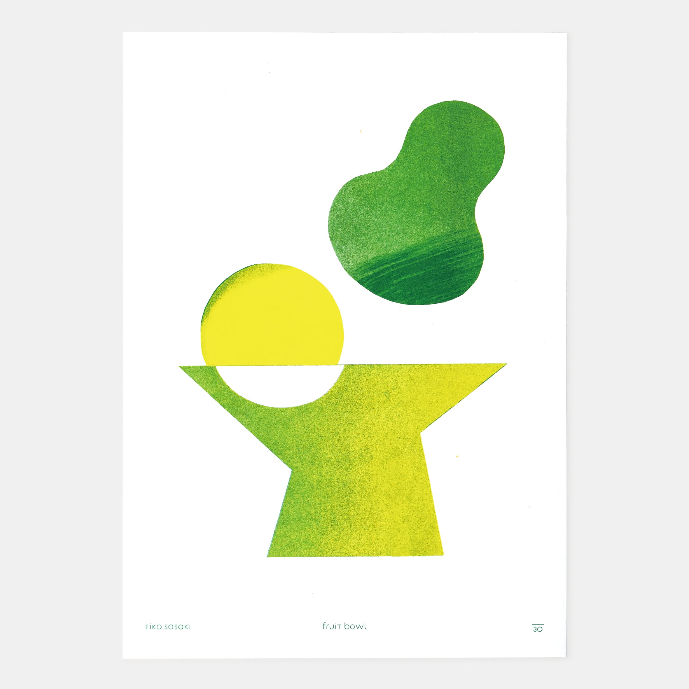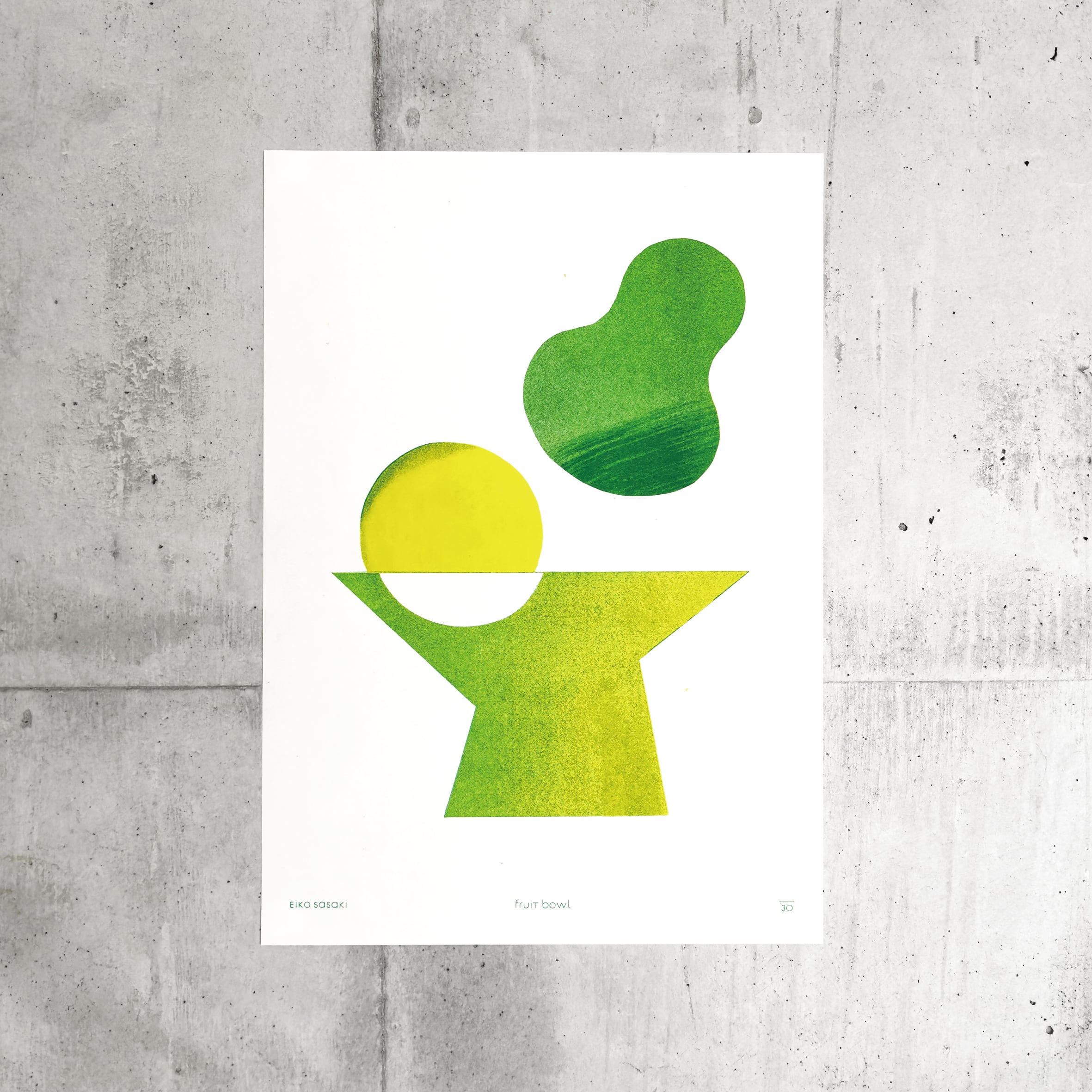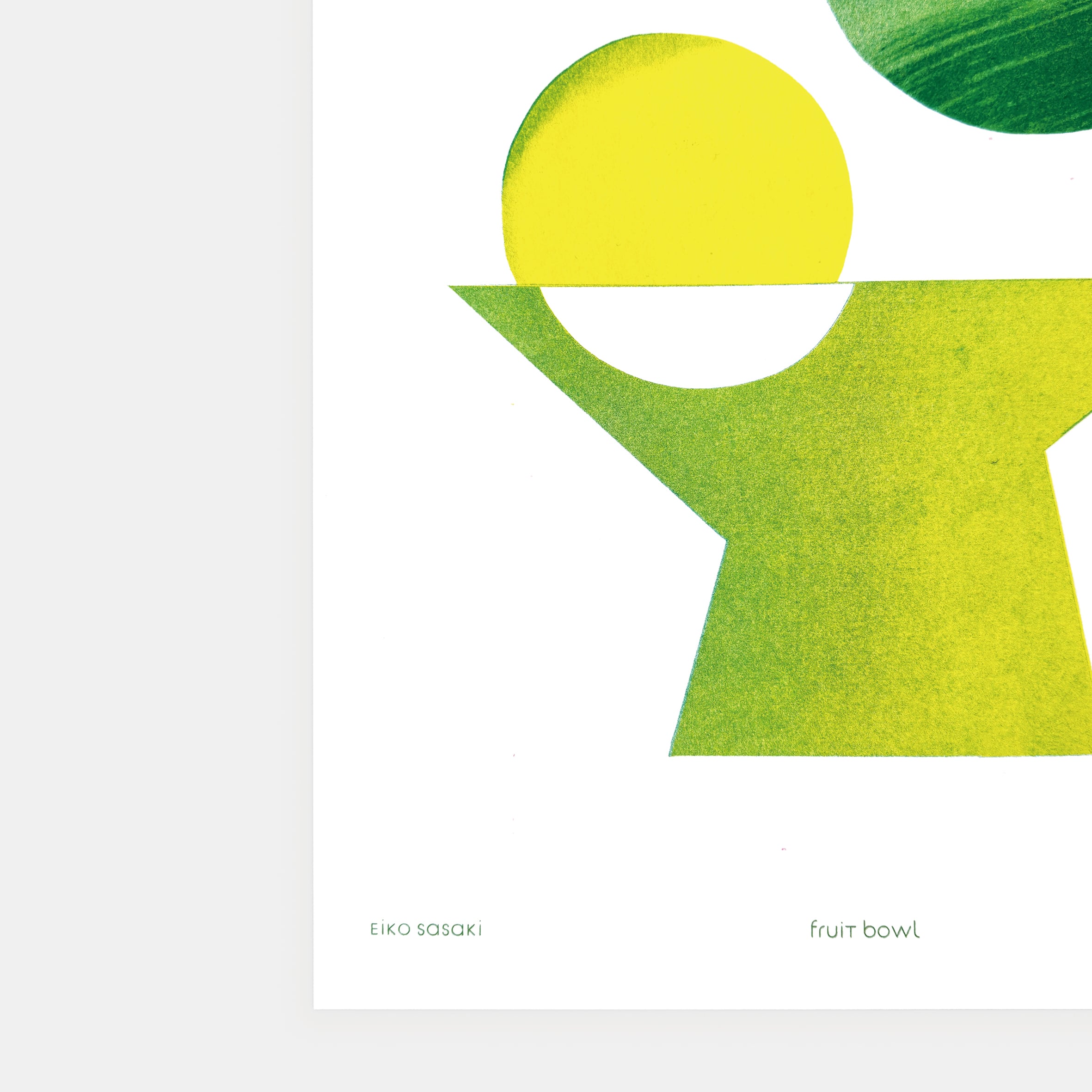 2023年に名古屋のON READINGで行われた個展「someday」のメインビジュアルとなった作品「fruit bowl」をイエローとグリーンの2色で表現したA3サイズのリソグラフポスター。用紙の「ポルカ|メレンゲ」はカラフルなチリが印象的な紙なので、リソグラフの特性でもある個体差をより感じられるものとなっています。プリンティングディレクションと印刷は喫水線|when pressの岡田和奈佳さん。手書きのエディションナンバー入り、限定30部。